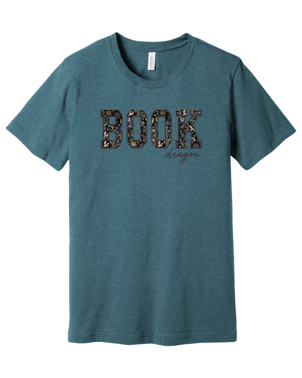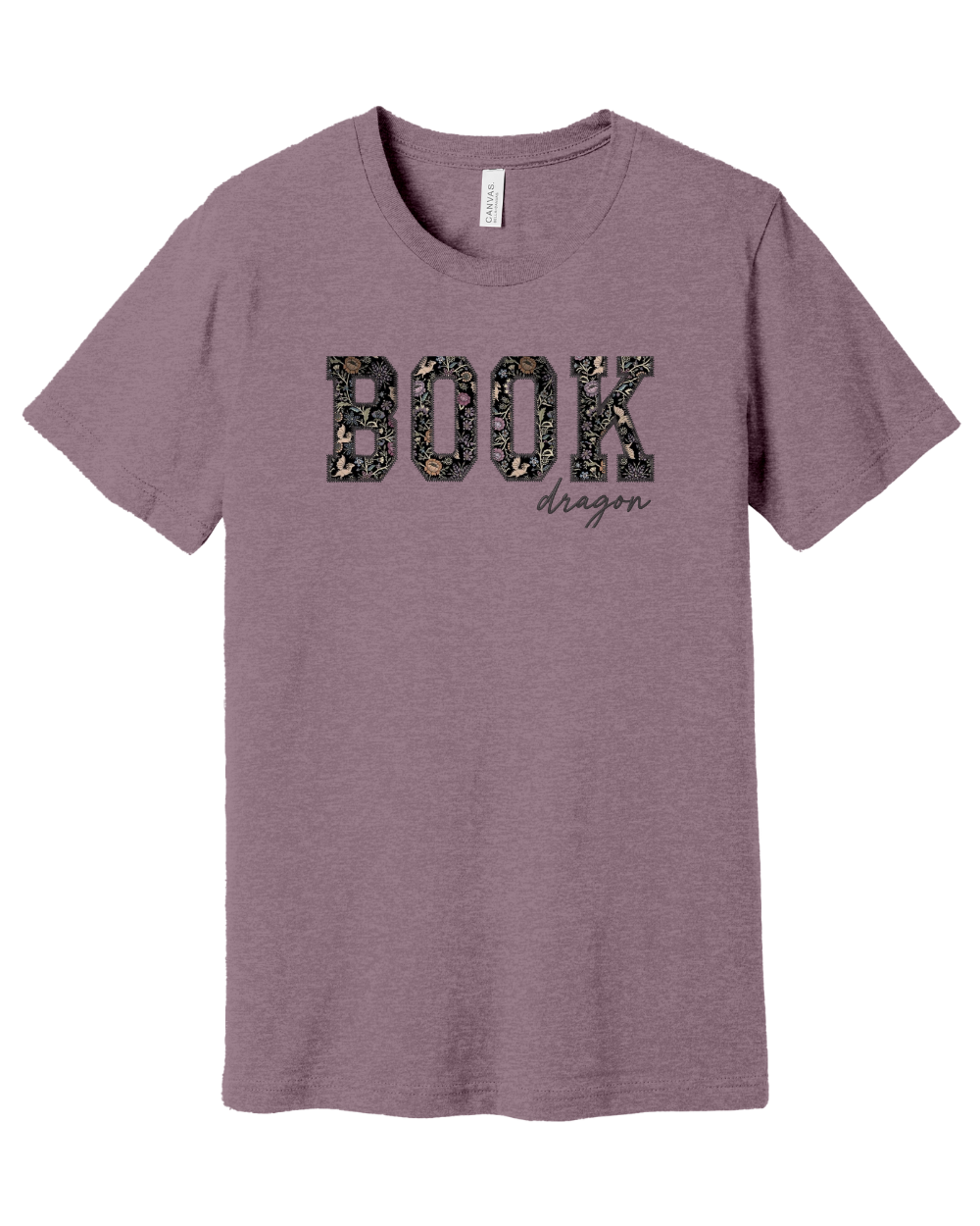 Handcrafted with care, this bookish tee features bold “BOOK” lettering in collegiate-style appliqué using fabric adorned with delicate florals and hidden dragons. Beneath it, “dragon” is stitched in elegant script for a cozy, magical touch. Whether your shelves are filled with Fourth Wing, ACOTAR, Eragon, or The Priory of the Orange Tree, this shirt celebrates your fiery love for fantasy.